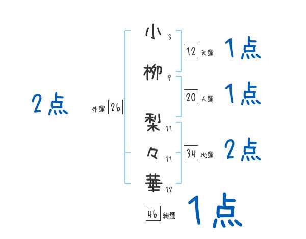 外運![]() | 小栁梨々華さんの外運は26画の2つ星!波瀾万丈かも。信頼できる人を大事にしましょう。 生活面を象徴する運勢です。外部から受ける影響力を表し、結婚運、家庭運や職場、環境への順応性を表します。 |