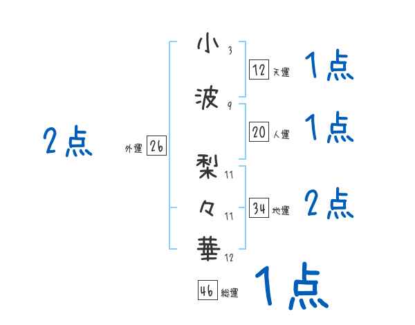 外運![]() | 小波梨々華さんの外運は26画の2つ星!波瀾万丈かも。信頼できる人を大事にしましょう。 生活面を象徴する運勢です。外部から受ける影響力を表し、結婚運、家庭運や職場、環境への順応性を表します。 |