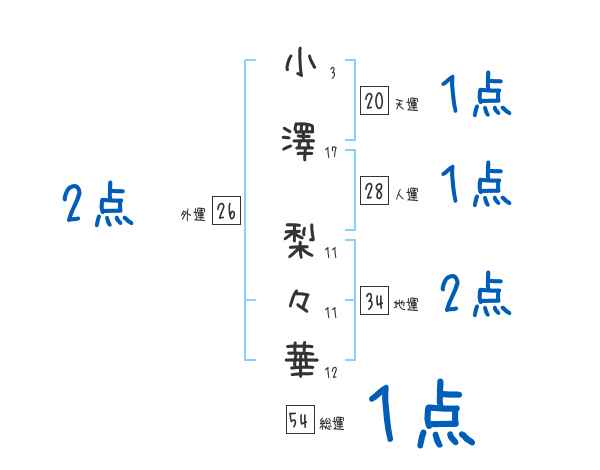| 総運  | 小澤梨々華さんの総運は54画の1つ星!トラブルが多いかも。周りをよく見て協調して過ごしましょう。あなたの人生を表す1番重要な運勢です。生涯を通じて影響する総合運となり、主に50歳以降の晩年期に影響を及ぼします。 |