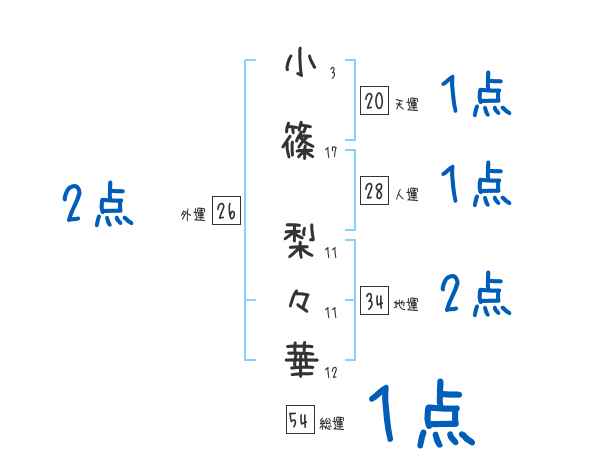 外運![]() | 小篠梨々華さんの外運は26画の2つ星!波瀾万丈かも。信頼できる人を大事にしましょう。 生活面を象徴する運勢です。外部から受ける影響力を表し、結婚運、家庭運や職場、環境への順応性を表します。 |