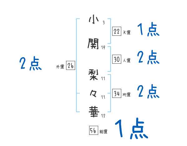 天運![]() | 小関梨々華さんの天運は22画の1つ星!努力することが苦手ないっぽう手先が器用。芸術性にも優れる。 家系が持つ宿命的な運勢を表します。祖先から受け継いだ苗字ですので自分の力が及びません。家柄を象徴します。 |