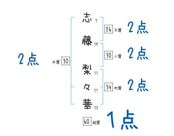 天運![]() | 志藤梨々華さんの天運は26画の2つ星!波瀾万丈かも。信頼できる人を大事にしましょう。 家系が持つ宿命的な運勢を表します。祖先から受け継いだ苗字ですので自分の力が及びません。家柄を象徴します。 |