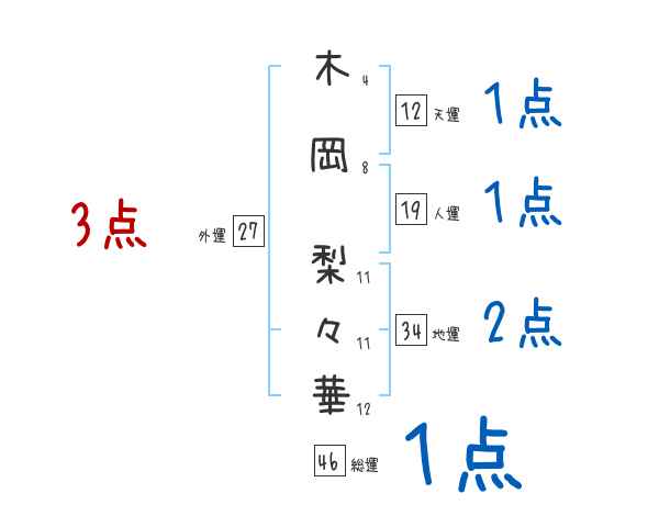 総運![]() | 木岡梨々華さんの総運は46画の1つ星!迷走することが多く苦労するかも。目先のことにとらわれないように。 あなたの人生を表す1番重要な運勢です。生涯を通じて影響する総合運となり、主に50歳以降の晩年期に影響を及ぼします。 |