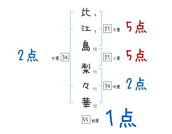 天運![]() | 比江島梨々華さんの天運は21画の5つ星!統率力がある。独立し成功する。名誉を手に入れる。 家系が持つ宿命的な運勢を表します。祖先から受け継いだ苗字ですので自分の力が及びません。家柄を象徴します。 |