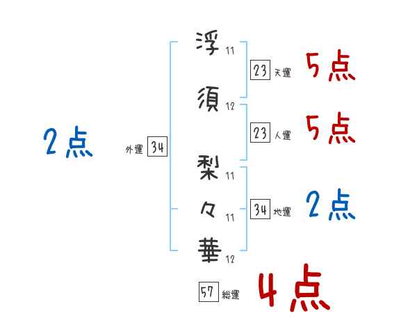 総運![]() | 浮須梨々華さんの総運は57画の4つ星!向上心があり人望がある。地位を得る。 あなたの人生を表す1番重要な運勢です。生涯を通じて影響する総合運となり、主に50歳以降の晩年期に影響を及ぼします。 |
