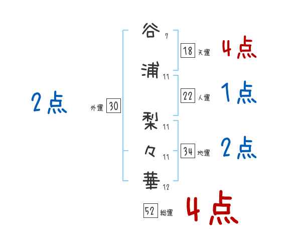 天運![]() | 谷浦梨々華さんの天運は18画の4つ星!情熱的で剛気。忍耐力があり信頼される。 家系が持つ宿命的な運勢を表します。祖先から受け継いだ苗字ですので自分の力が及びません。家柄を象徴します。 |