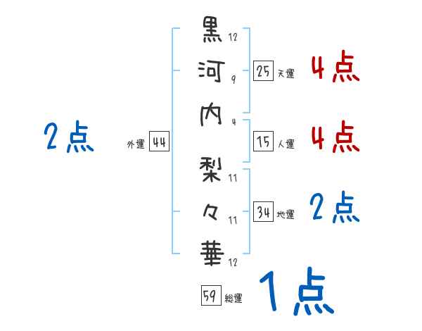 外運![]() | 黒河内梨々華さんの外運は44画の2つ星!誠実で慎重な性格。物事を考えすぎないように注意しましょう。 生活面を象徴する運勢です。外部から受ける影響力を表し、結婚運、家庭運や職場、環境への順応性を表します。 |