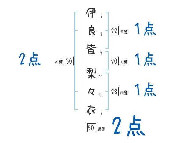 外運![]() | 伊良皆梨々衣さんの外運は30画の2つ星!浮き沈みの激しさに注意しましょう。 生活面を象徴する運勢です。外部から受ける影響力を表し、結婚運、家庭運や職場、環境への順応性を表します。 |