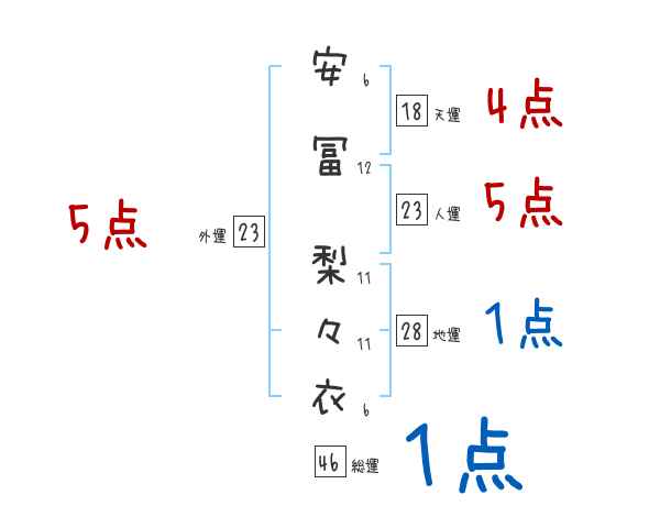 外運![]() | 安冨梨々衣さんの外運は23画の5つ星!想像力に優れ活力がある。一代で成功し名誉を手に入れる。 生活面を象徴する運勢です。外部から受ける影響力を表し、結婚運、家庭運や職場、環境への順応性を表します。 |