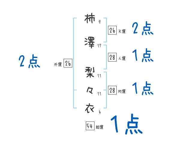 天運![]() | 柿澤梨々衣さんの天運は26画の2つ星!波瀾万丈かも。信頼できる人を大事にしましょう。 家系が持つ宿命的な運勢を表します。祖先から受け継いだ苗字ですので自分の力が及びません。家柄を象徴します。 |