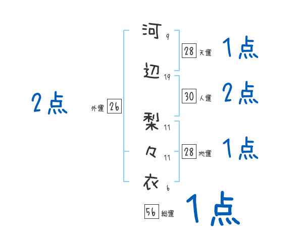 外運![]() | 河辺梨々衣さんの外運は26画の2つ星!波瀾万丈かも。信頼できる人を大事にしましょう。 生活面を象徴する運勢です。外部から受ける影響力を表し、結婚運、家庭運や職場、環境への順応性を表します。 |