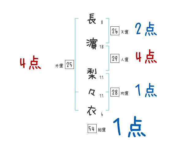 天運![]() | 長濵梨々衣さんの天運は26画の2つ星!波瀾万丈かも。信頼できる人を大事にしましょう。 家系が持つ宿命的な運勢を表します。祖先から受け継いだ苗字ですので自分の力が及びません。家柄を象徴します。 |