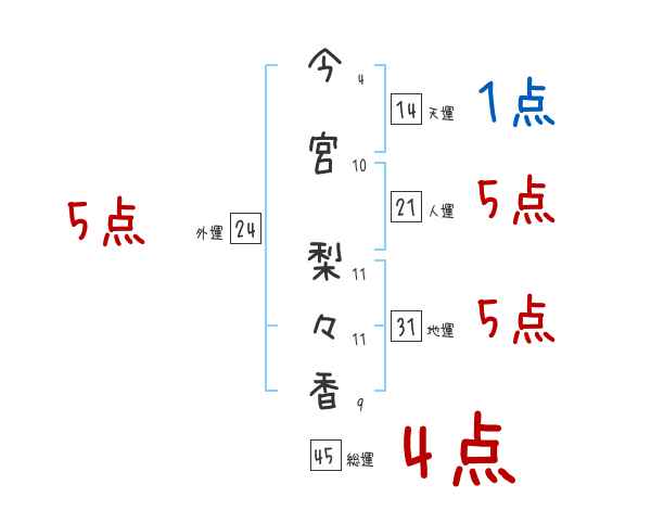 外運![]() | 今宮梨々香さんの外運は24画の5つ星!家庭運が良く順調な人生。金運にも恵まれる。 生活面を象徴する運勢です。外部から受ける影響力を表し、結婚運、家庭運や職場、環境への順応性を表します。 |