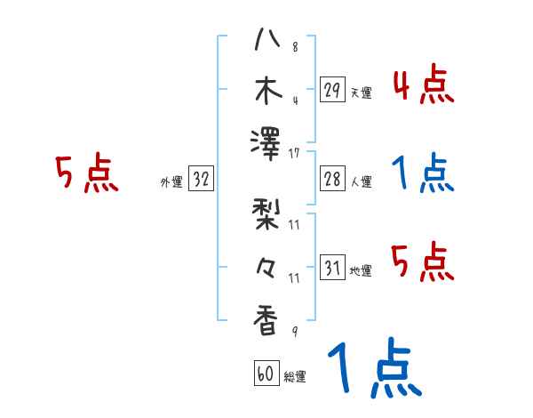 外運![]() | 八木澤梨々香さんの外運は32画の5つ星!柔軟性があり成功する。チャンスが多く金運が良い。 生活面を象徴する運勢です。外部から受ける影響力を表し、結婚運、家庭運や職場、環境への順応性を表します。 |