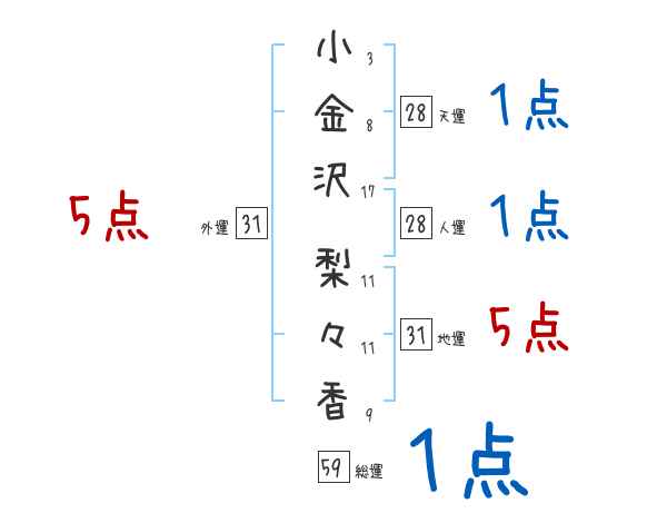 天運![]() | 小金沢梨々香さんの天運は28画の1つ星!家庭環境に注意。スポーツで活躍できる能力があるかも。 家系が持つ宿命的な運勢を表します。祖先から受け継いだ苗字ですので自分の力が及びません。家柄を象徴します。 |