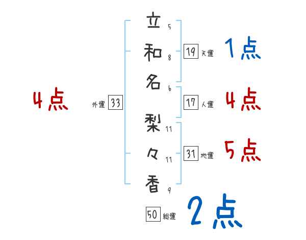外運![]() | 立和名梨々香さんの外運は33画の4つ星!権力志向でプライドが高い。勇気があり運を切り開き成功する。 生活面を象徴する運勢です。外部から受ける影響力を表し、結婚運、家庭運や職場、環境への順応性を表します。 |