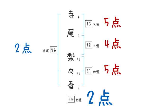 総運![]() | 寺尾梨々香さんの総運は44画の2つ星!誠実で慎重な性格。物事を考えすぎないように注意しましょう。 あなたの人生を表す1番重要な運勢です。生涯を通じて影響する総合運となり、主に50歳以降の晩年期に影響を及ぼします。 |