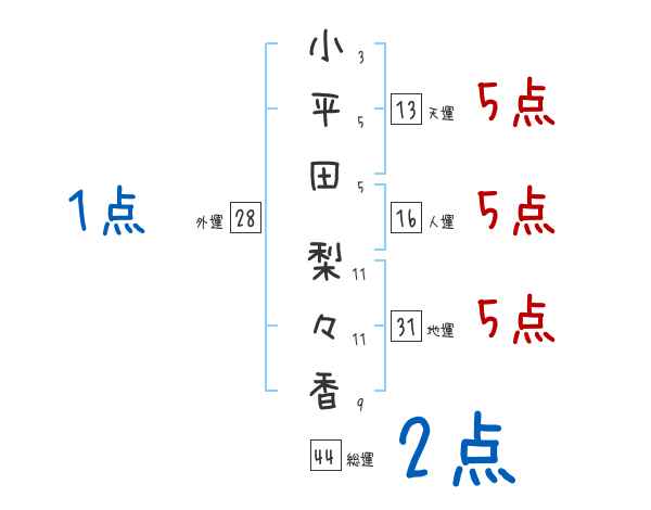 総運![]() | 小平田梨々香さんの総運は44画の2つ星!誠実で慎重な性格。物事を考えすぎないように注意しましょう。 あなたの人生を表す1番重要な運勢です。生涯を通じて影響する総合運となり、主に50歳以降の晩年期に影響を及ぼします。 |