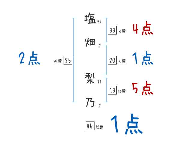 総運![]() | 塩畑梨乃さんの総運は46画の1つ星!迷走することが多く苦労するかも。目先のことにとらわれないように。 あなたの人生を表す1番重要な運勢です。生涯を通じて影響する総合運となり、主に50歳以降の晩年期に影響を及ぼします。 |