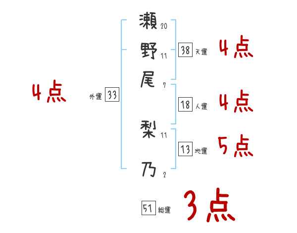外運![]() | 瀬野尾梨乃さんの外運は33画の4つ星!権力志向でプライドが高い。勇気があり運を切り開き成功する。 生活面を象徴する運勢です。外部から受ける影響力を表し、結婚運、家庭運や職場、環境への順応性を表します。 |