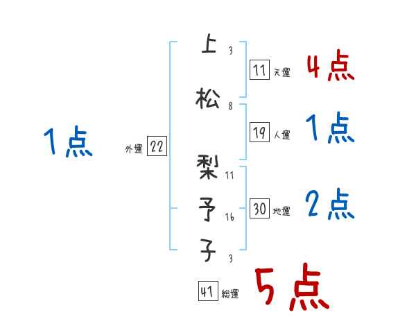天運![]() | 上松梨予子さんの天運は11画の4つ星!着実に富や地位を得る幸運な人生。 家系が持つ宿命的な運勢を表します。祖先から受け継いだ苗字ですので自分の力が及びません。家柄を象徴します。 |