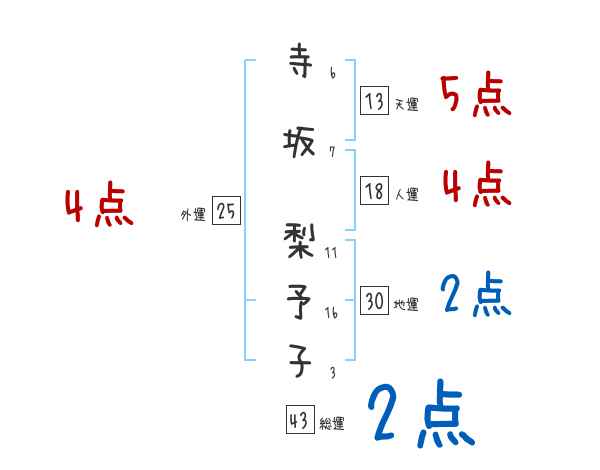 総運![]() | 寺坂梨予子さんの総運は43画の2つ星!頑固な性格で独立心が強いかも。やや非現実的で浪費に注意しましょう。 あなたの人生を表す1番重要な運勢です。生涯を通じて影響する総合運となり、主に50歳以降の晩年期に影響を及ぼします。 |
