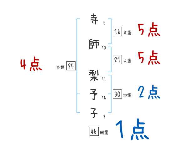 人運![]() | 寺師梨予子さんの人運は21画の5つ星!統率力がある。独立し成功する。名誉を手に入れる。 性格や才能などを表す2番目に重要な運勢です。人間関係や協調性、社会的な成功に影響します。主に20歳から50歳ぐらいまでの中年期の運勢を表します。 |
