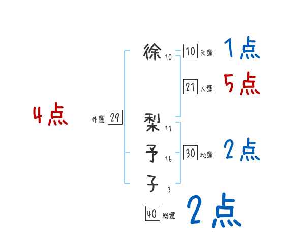 人運![]() | 徐梨予子さんの人運は21画の5つ星!統率力がある。独立し成功する。名誉を手に入れる。 性格や才能などを表す2番目に重要な運勢です。人間関係や協調性、社会的な成功に影響します。主に20歳から50歳ぐらいまでの中年期の運勢を表します。 |