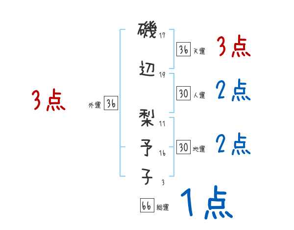 外運![]() | 磯辺梨予子さんの外運は36画の3つ星!先見性が豊かです。多少神経質で苦労することも。 生活面を象徴する運勢です。外部から受ける影響力を表し、結婚運、家庭運や職場、環境への順応性を表します。 |