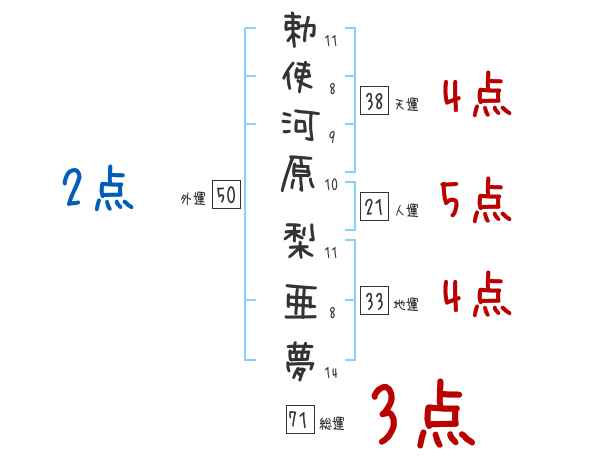 人運![]() | 勅使河原梨亜夢さんの人運は21画の5つ星!統率力がある。独立し成功する。名誉を手に入れる。 性格や才能などを表す2番目に重要な運勢です。人間関係や協調性、社会的な成功に影響します。主に20歳から50歳ぐらいまでの中年期の運勢を表します。 |