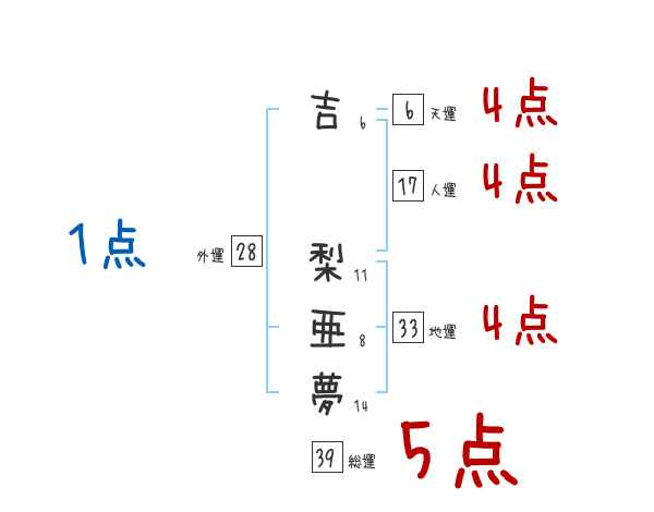 天運![]() | 吉梨亜夢さんの天運は6画の4つ星!慎重な努力家で信頼を得る。誠実な精神で向上心に優れる。 家系が持つ宿命的な運勢を表します。祖先から受け継いだ苗字ですので自分の力が及びません。家柄を象徴します。 |