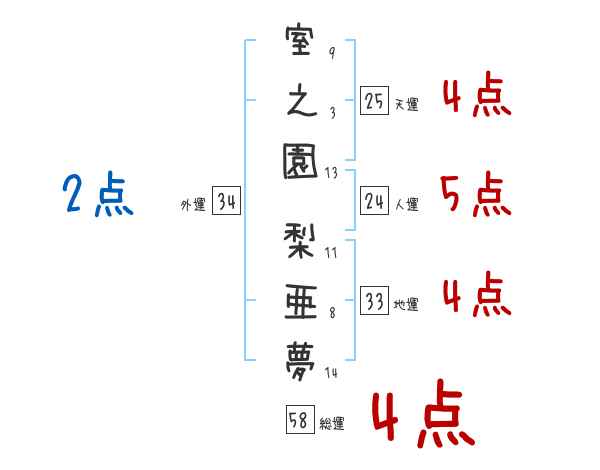 総運![]() | 室之園梨亜夢さんの総運は58画の4つ星!安定した生活。大器晩成タイプ。 あなたの人生を表す1番重要な運勢です。生涯を通じて影響する総合運となり、主に50歳以降の晩年期に影響を及ぼします。 |
