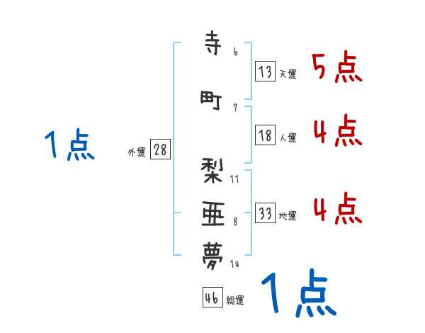 天運![]() | 寺町梨亜夢さんの天運は13画の5つ星!才能に恵まれ人気がある。名声を手に入れる。円満な人生。 家系が持つ宿命的な運勢を表します。祖先から受け継いだ苗字ですので自分の力が及びません。家柄を象徴します。 |