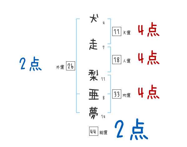 天運![]() | 犬走梨亜夢さんの天運は11画の4つ星!着実に富や地位を得る幸運な人生。 家系が持つ宿命的な運勢を表します。祖先から受け継いだ苗字ですので自分の力が及びません。家柄を象徴します。 |