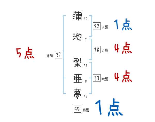 天運![]() | 蒲池梨亜夢さんの天運は22画の1つ星!努力することが苦手ないっぽう手先が器用。芸術性にも優れる。 家系が持つ宿命的な運勢を表します。祖先から受け継いだ苗字ですので自分の力が及びません。家柄を象徴します。 |