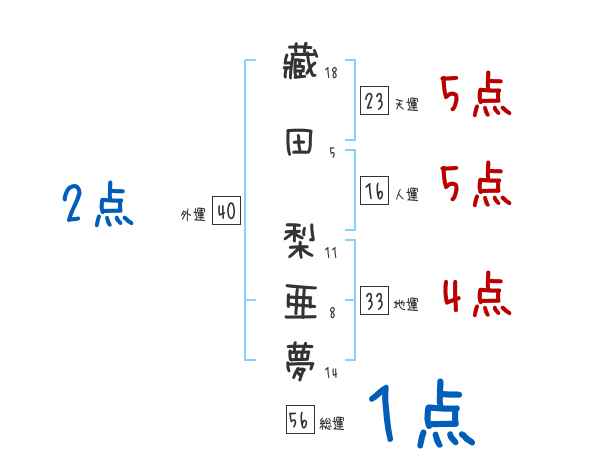 天運![]() | 藏田梨亜夢さんの天運は23画の5つ星!想像力に優れ活力がある。一代で成功し名誉を手に入れる。 家系が持つ宿命的な運勢を表します。祖先から受け継いだ苗字ですので自分の力が及びません。家柄を象徴します。 |