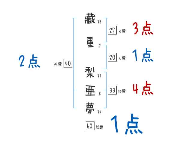 外運![]() | 藏重梨亜夢さんの外運は40画の2つ星!自信過剰で物事に固執するためトラブルに注意。 生活面を象徴する運勢です。外部から受ける影響力を表し、結婚運、家庭運や職場、環境への順応性を表します。 |