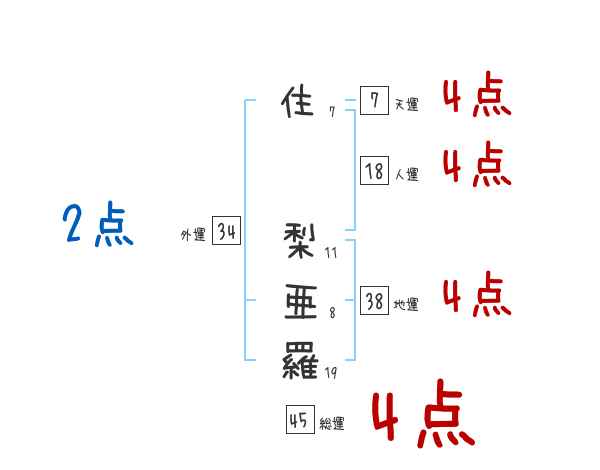 外運![]() | 住梨亜羅さんの外運は34画の2つ星!独創性に優れるが、自尊心が強く災難に注意しましょう。 生活面を象徴する運勢です。外部から受ける影響力を表し、結婚運、家庭運や職場、環境への順応性を表します。 |