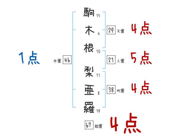 外運![]() | 駒木根梨亜羅さんの外運は46画の1つ星!迷走することが多く苦労するかも。目先のことにとらわれないように。 生活面を象徴する運勢です。外部から受ける影響力を表し、結婚運、家庭運や職場、環境への順応性を表します。 |