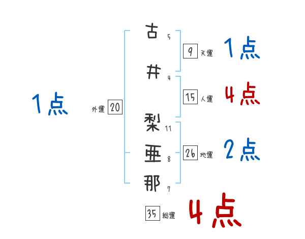 天運![]() | 古井梨亜那さんの天運は9画の1つ星!消極的で才能を発揮することが苦手なことも。周りの意見に耳を傾けましょう。 家系が持つ宿命的な運勢を表します。祖先から受け継いだ苗字ですので自分の力が及びません。家柄を象徴します。 |