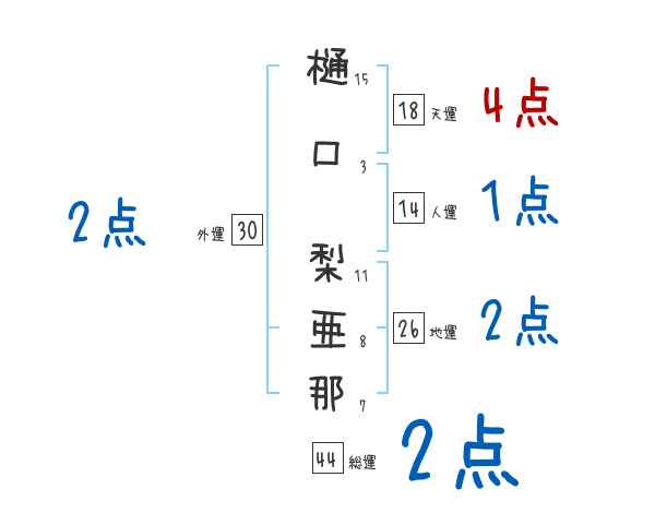 総運![]() | 樋口梨亜那さんの総運は44画の2つ星!誠実で慎重な性格。物事を考えすぎないように注意しましょう。 あなたの人生を表す1番重要な運勢です。生涯を通じて影響する総合運となり、主に50歳以降の晩年期に影響を及ぼします。 |
