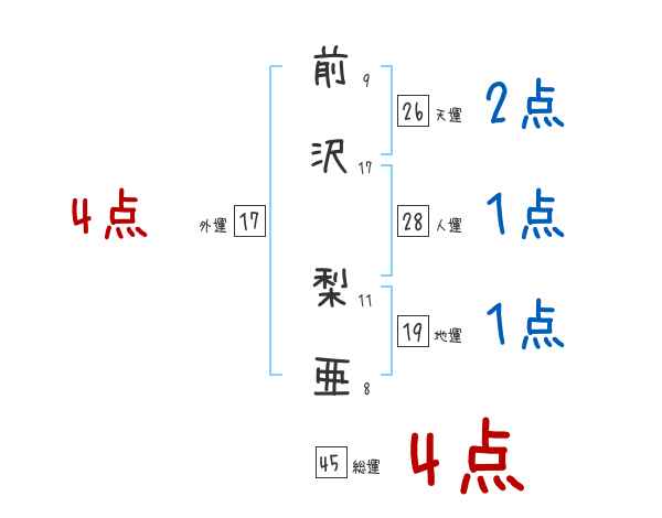 天運![]() | 前沢梨亜さんの天運は26画の2つ星!波瀾万丈かも。信頼できる人を大事にしましょう。 家系が持つ宿命的な運勢を表します。祖先から受け継いだ苗字ですので自分の力が及びません。家柄を象徴します。 |