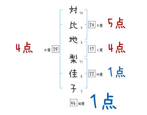 外運![]() | 対比地梨佳子さんの外運は29画の4つ星!完全主義で才能がある。厳格な心の持ち主。 生活面を象徴する運勢です。外部から受ける影響力を表し、結婚運、家庭運や職場、環境への順応性を表します。 |