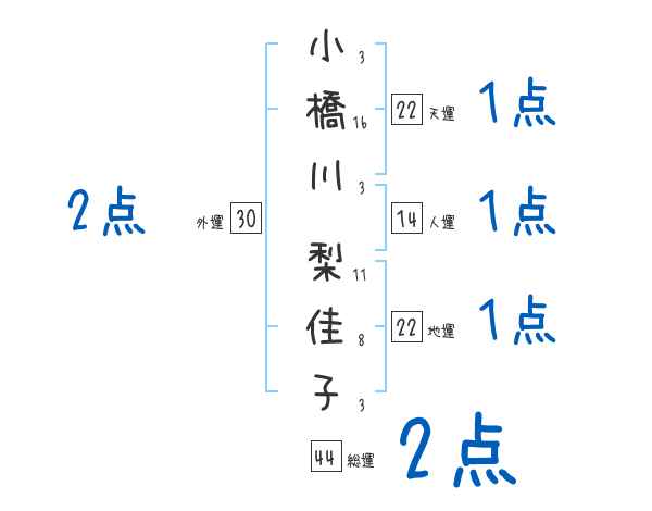 天運![]() | 小橋川梨佳子さんの天運は22画の1つ星!努力することが苦手ないっぽう手先が器用。芸術性にも優れる。 家系が持つ宿命的な運勢を表します。祖先から受け継いだ苗字ですので自分の力が及びません。家柄を象徴します。 |