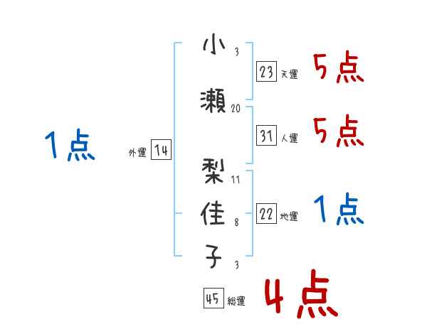 天運![]() | 小瀬梨佳子さんの天運は23画の5つ星!想像力に優れ活力がある。一代で成功し名誉を手に入れる。 家系が持つ宿命的な運勢を表します。祖先から受け継いだ苗字ですので自分の力が及びません。家柄を象徴します。 |