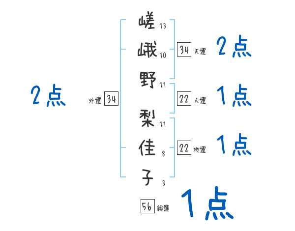 人運![]() | 嵯峨野梨佳子さんの人運は22画の1つ星!努力することが苦手ないっぽう手先が器用。芸術性にも優れる。 性格や才能などを表す2番目に重要な運勢です。人間関係や協調性、社会的な成功に影響します。主に20歳から50歳ぐらいまでの中年期の運勢を表します。 |