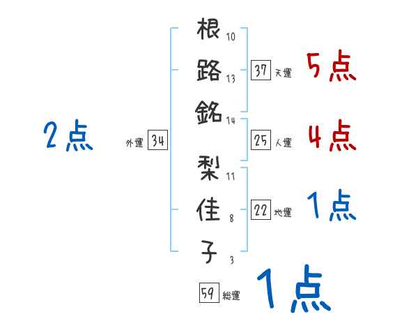 天運![]() | 根路銘梨佳子さんの天運は37画の5つ星!努力家で順応性に優れる。現実的な考え方ができ忠実に物事をこなす。 家系が持つ宿命的な運勢を表します。祖先から受け継いだ苗字ですので自分の力が及びません。家柄を象徴します。 |