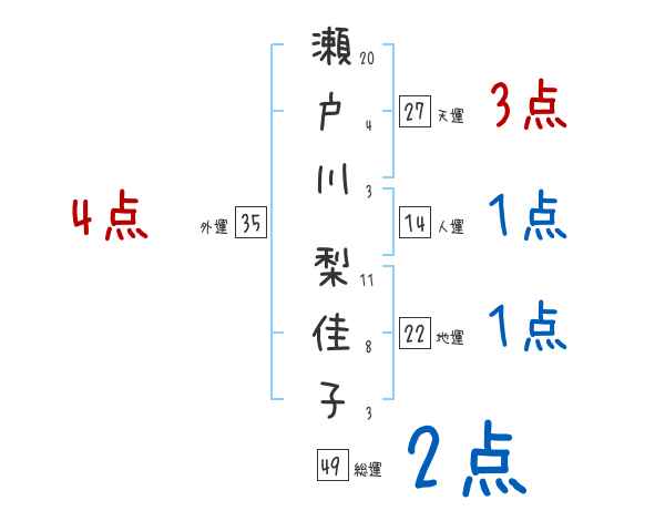 外運![]() | 瀬戸川梨佳子さんの外運は35画の4つ星!温厚な性格で感受性が高い。穏和な性格で人望が厚い。 生活面を象徴する運勢です。外部から受ける影響力を表し、結婚運、家庭運や職場、環境への順応性を表します。 |