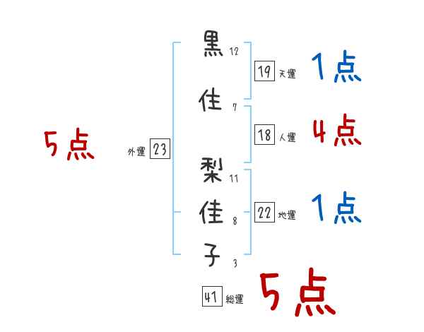 外運![]() | 黒住梨佳子さんの外運は23画の5つ星!想像力に優れ活力がある。一代で成功し名誉を手に入れる。 生活面を象徴する運勢です。外部から受ける影響力を表し、結婚運、家庭運や職場、環境への順応性を表します。 |