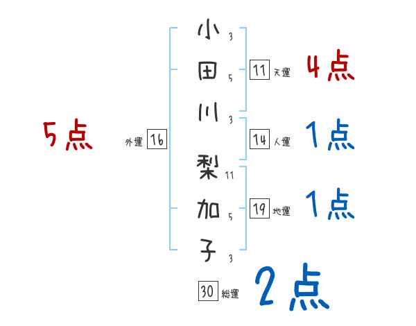 天運![]() | 小田川梨加子さんの天運は11画の4つ星!着実に富や地位を得る幸運な人生。 家系が持つ宿命的な運勢を表します。祖先から受け継いだ苗字ですので自分の力が及びません。家柄を象徴します。 |